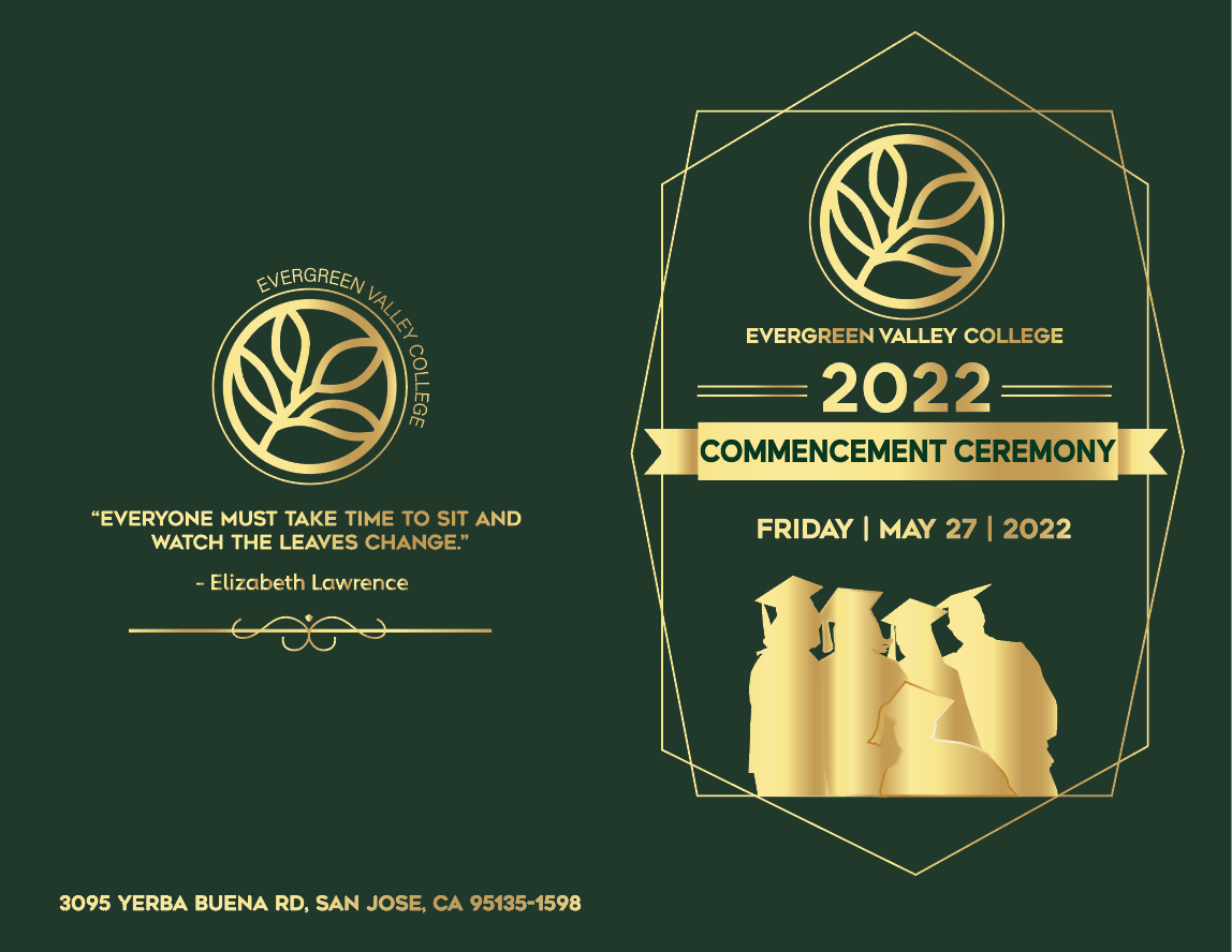 Each semester, Evergreen Valley College partners with the Graphic Design class to host a design competition for the cover of the college's graduation program. Out of numerous submissions, the top three designs are selected and the designers are awarded prizes as recognition for their creativity and innovation.